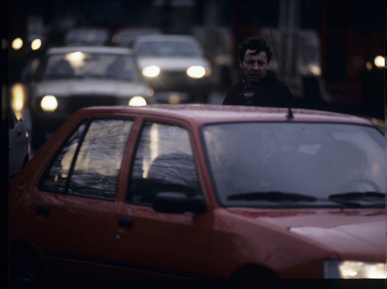 Karol (Zbigniew Zamachowski) stops a car with “Blondynka” (Grażyna Szapołowska) driving down the street.