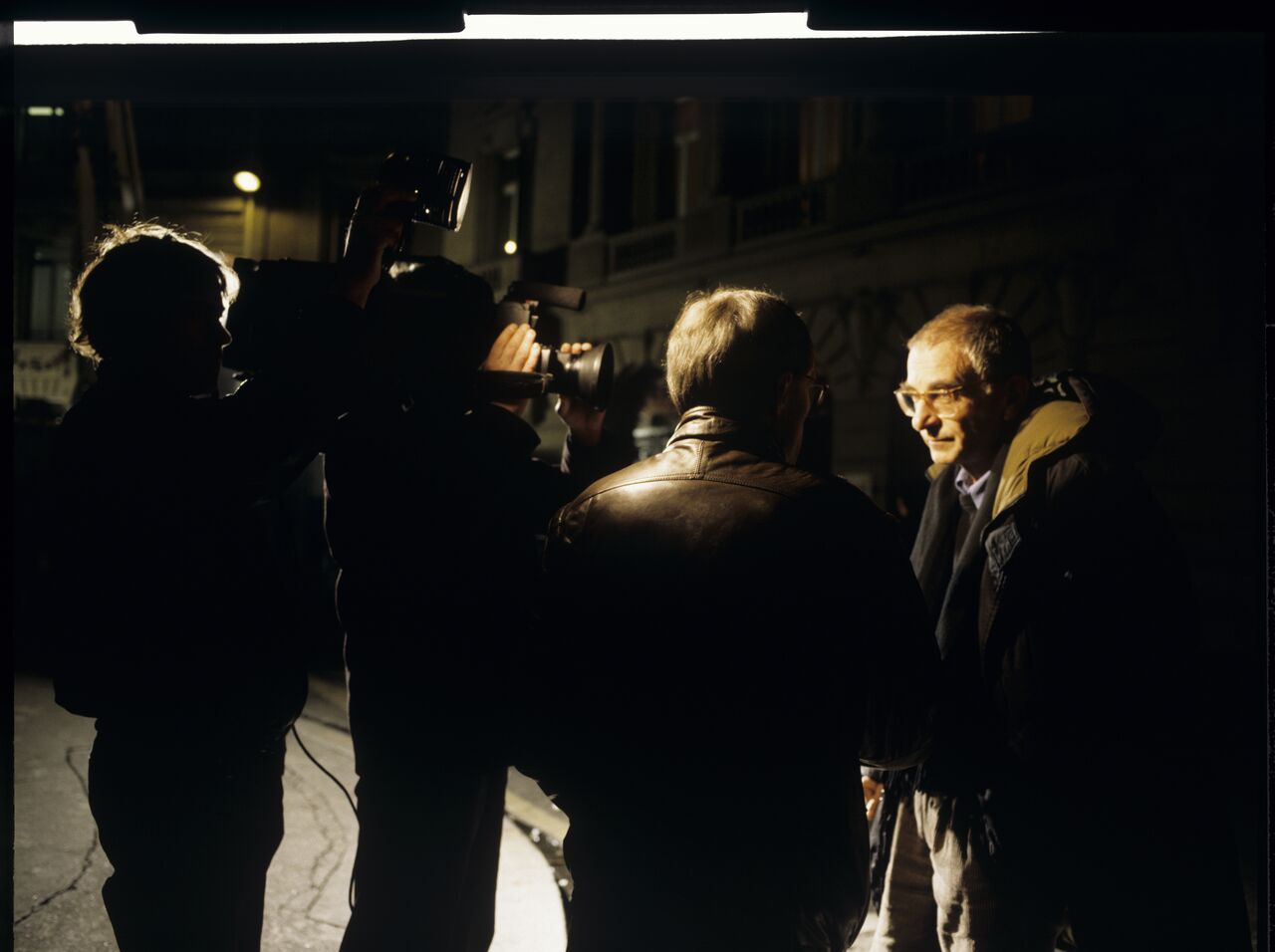 Krzysztof Kieślowski (director) surrounded by the crew on the shooting set.