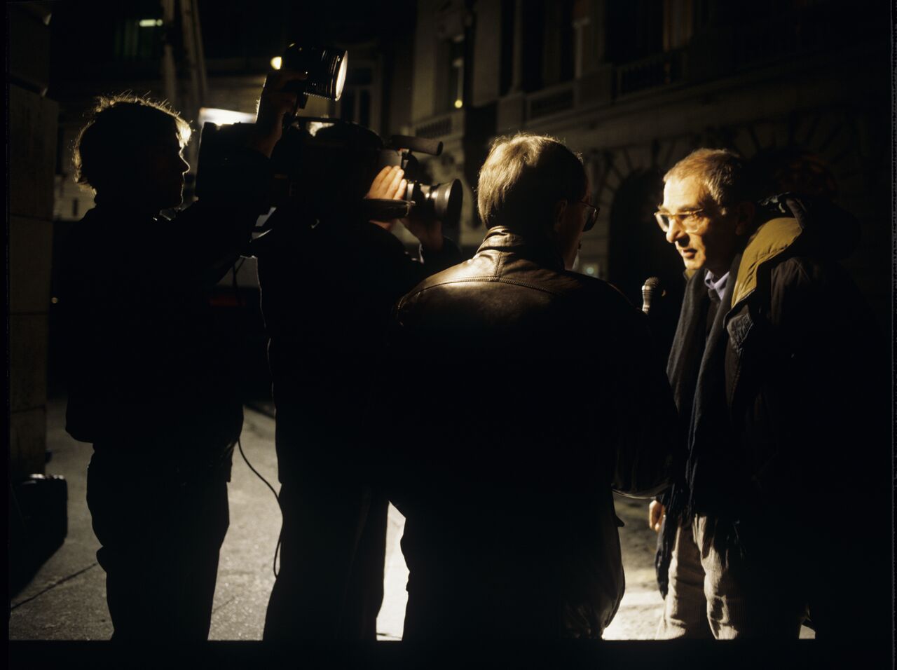 Krzysztof Kieślowski (director) surrounded by the crew on the shooting set.