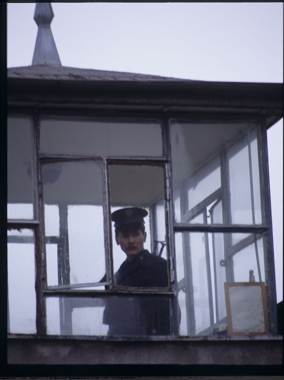 A guard in the watchtower of the prison where Karol’s wife, Dominique, is serving her sentence.