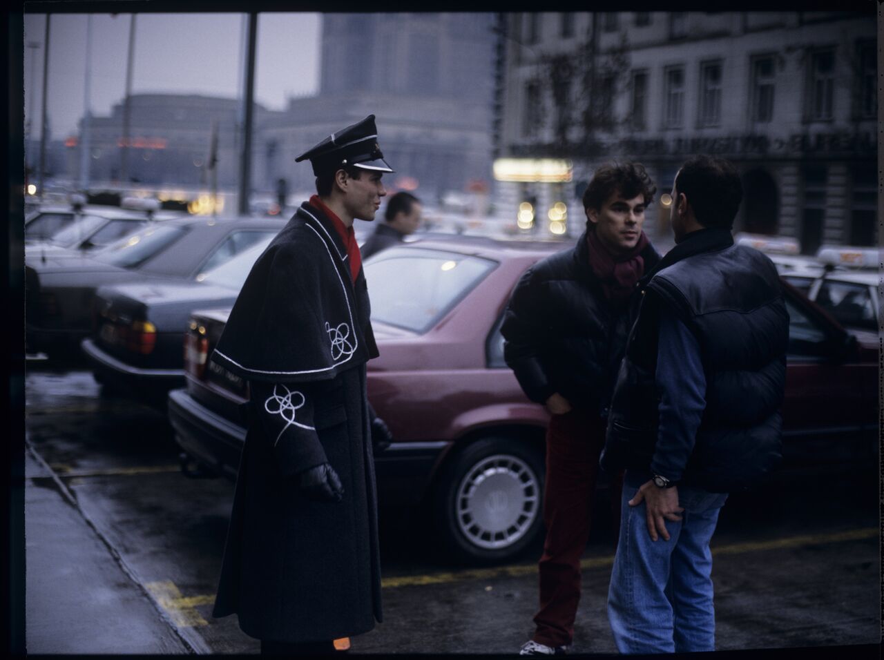 Passersby on a Warsaw street where Karol’s car is parked. Karol (Zbigniew Zamachowski) passes by in the background, heading towards the car.