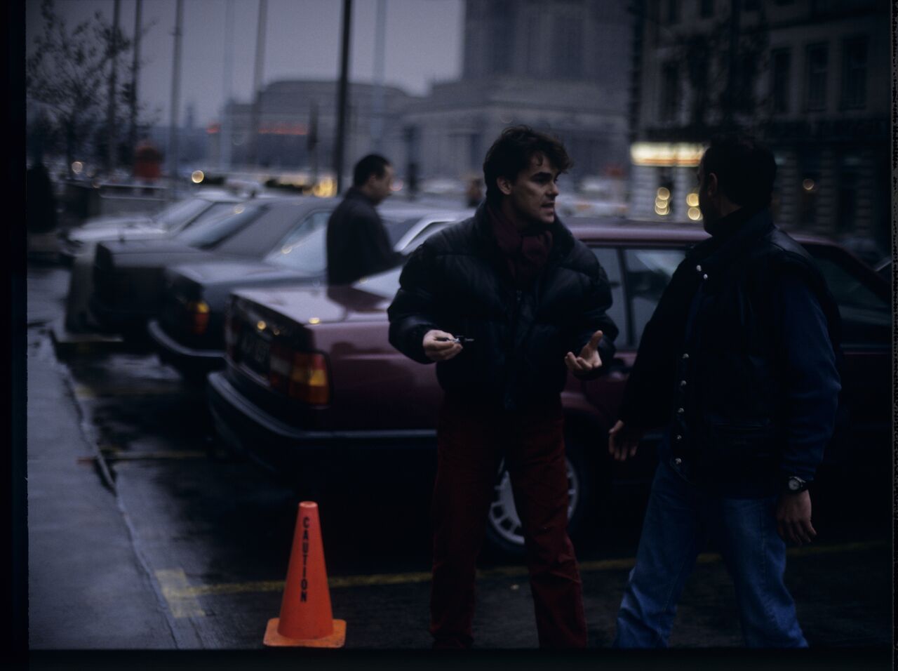 Passersby on a Warsaw street where Karol’s car is parked. Karol (Zbigniew Zamachowski) passes by in the background, heading towards the car.