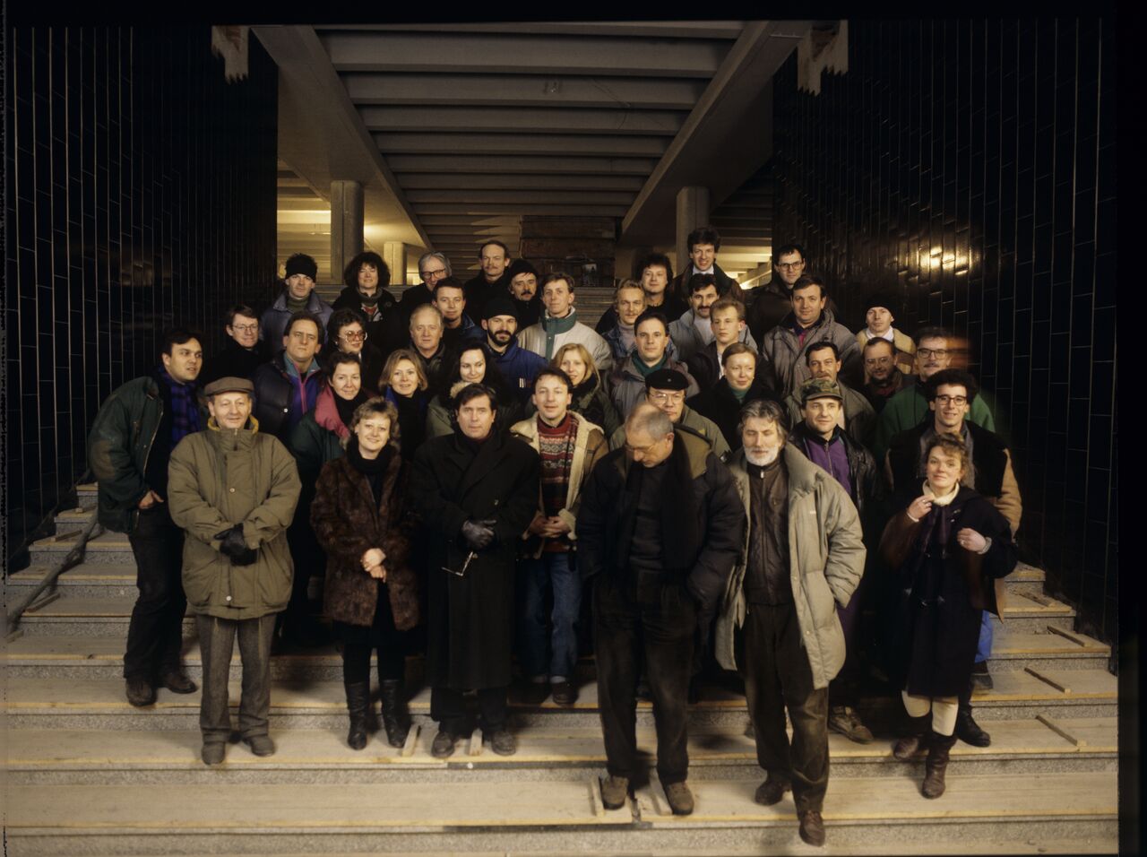 A group photo of the crew of the film “Three Colors. White”. Visible, among others: actors Zbigniew Zamachowski and Janusz Gajos, director Krzysztof Kieślowski, cameraman Edward Kłosiński, assistant director Paweł Łoziński, co-director Teresa Violetta Buhl, assistant director Stan Latek, camera assistants Henryk Jedynak and Muriel Coulin, still photographer Piotr Jaxa, set secretary Genevieve Dufour, sound operators Jean-Claude Laureux and Brigitte Taillandier, film critic Tadeusz Sobolewski and others.
