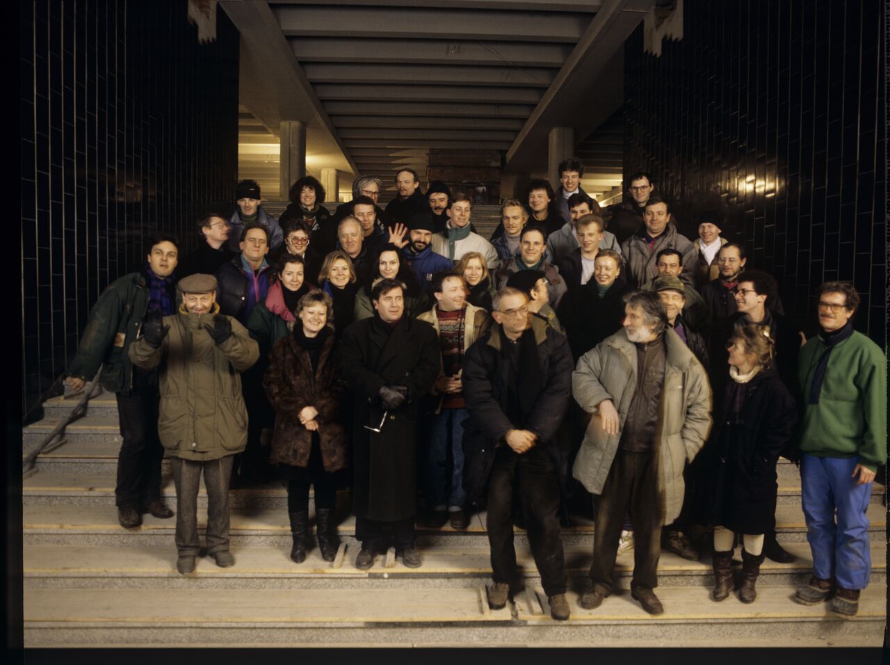A group photo of the crew of the film “Three Colors. White”. Visible, among others: actors Zbigniew Zamachowski and Janusz Gajos, director Krzysztof Kieślowski, cameraman Edward Kłosiński, assistant director Paweł Łoziński, co-director Teresa Violetta Buhl, assistant director Stan Latek, camera assistants Henryk Jedynak and Muriel Coulin, still photographer Piotr Jaxa, set secretary Genevieve Dufour, sound operators Jean-Claude Laureux and Brigitte Taillandier, film critic Tadeusz Sobolewski and others.