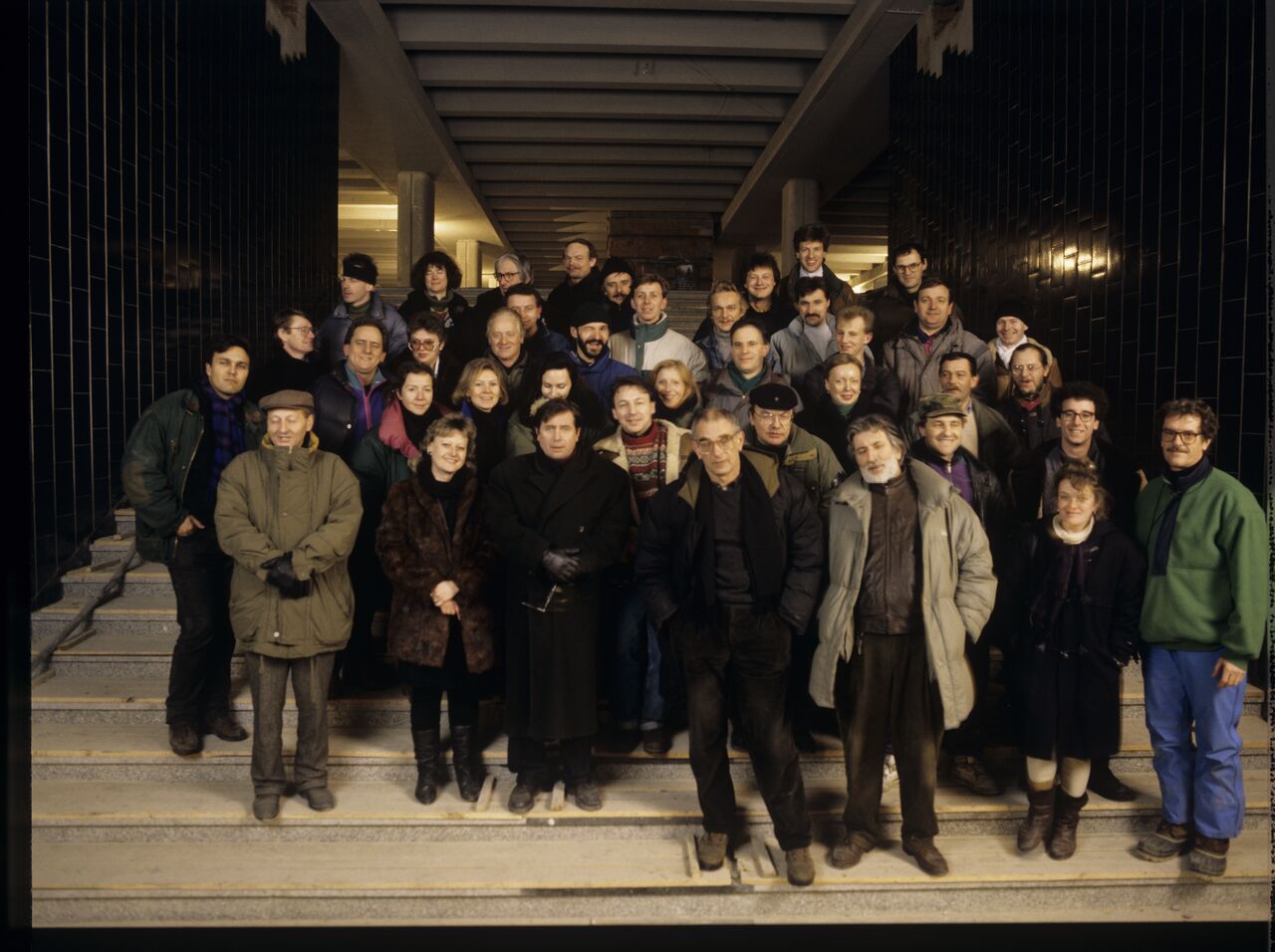 A group photo of the crew of the film “Three Colors. White”. Visible, among others: actors Zbigniew Zamachowski and Janusz Gajos, director Krzysztof Kieślowski, cameraman Edward Kłosiński, assistant director Paweł Łoziński, co-director Teresa Violetta Buhl, assistant director Stan Latek, camera assistants Henryk Jedynak and Muriel Coulin, still photographer Piotr Jaxa, set secretary Genevieve Dufour, sound operators Jean-Claude Laureux and Brigitte Taillandier, film critic Tadeusz Sobolewski and others.