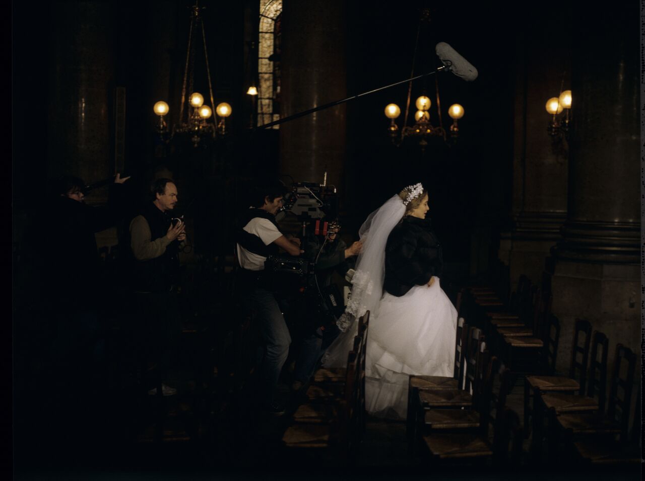 Shooting the wedding scene of Dominique and Charles in a Parisian church. In the photo, Julie Delpy as the bride and crew members: Henryk Jedynak (Director of Photography), Brigitte Taillandier (sound operator).