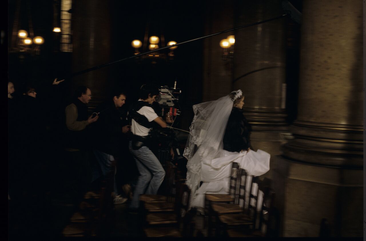 Shooting the wedding scene of Dominique and Charles in a Parisian church. In the photo, Julie Delpy as the bride and crew members: Henryk Jedynak (Director of Photography), Brigitte Taillandier (sound operator).