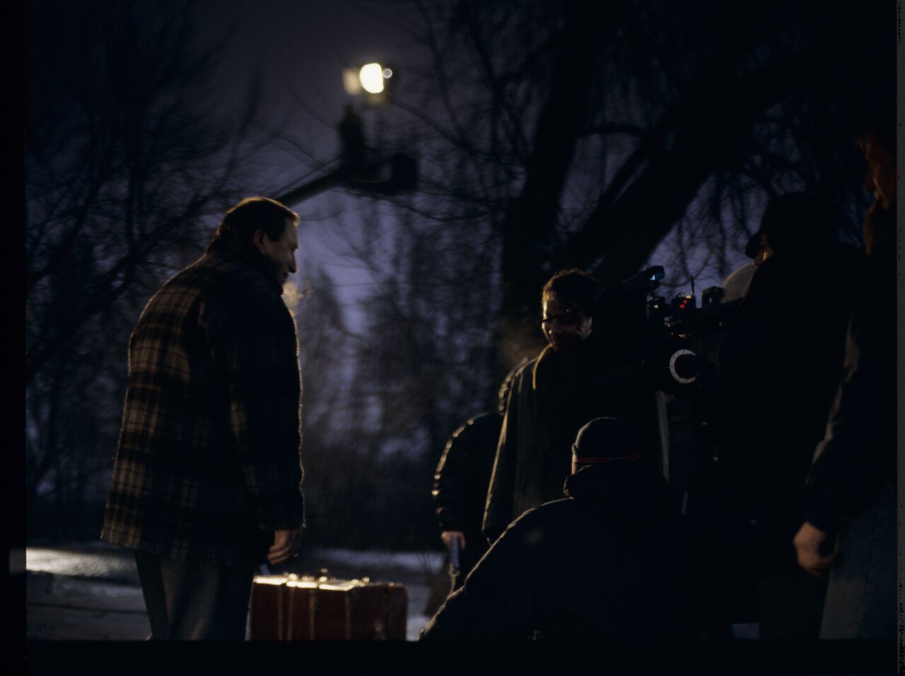 The set during the filming of the scene of Karol’s arrival at his brother’s house. In the photo, actors Jerzy Stuhr and Zbigniew Zamachowski and Krzysztof Kieślowski (director) surrounded by the crew.