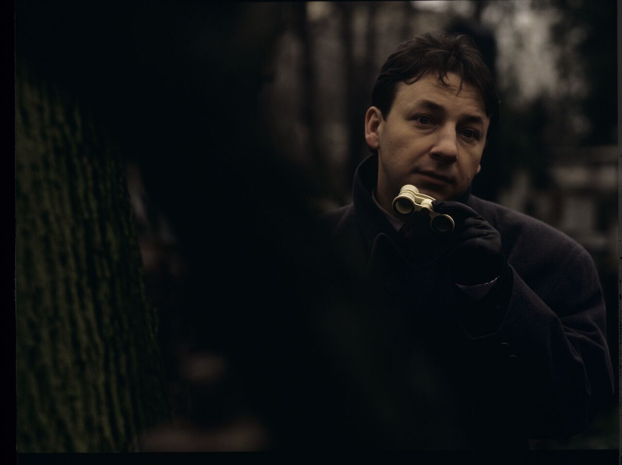 Karol (Zbigniew Zamachowski) observes his own funeral through binoculars.