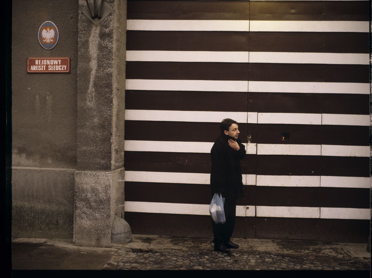 Karol (Zbigniew Zamachowski) by the prison gate.