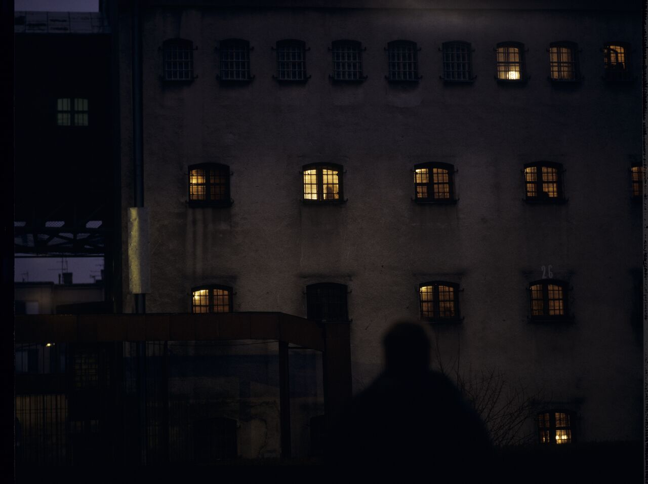 Karol (Zbigniew Zamachowski) in front of the prison building. In the window we can see the silhouette of his wife Domonique (Julie Delpy).