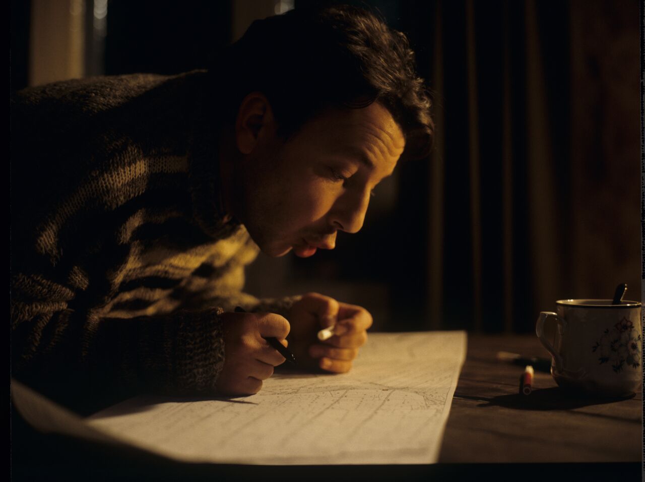 Karol (Zbigniew Zamachowski) looking at pland of lands he purchased.