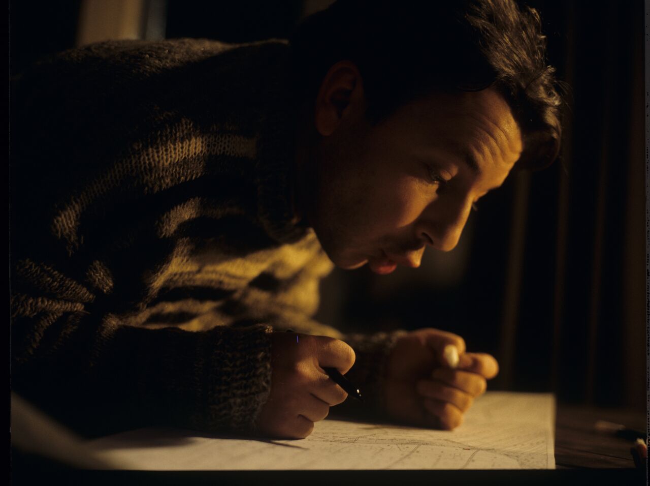 Karol (Zbigniew Zamachowski) looking at pland of lands he purchased.