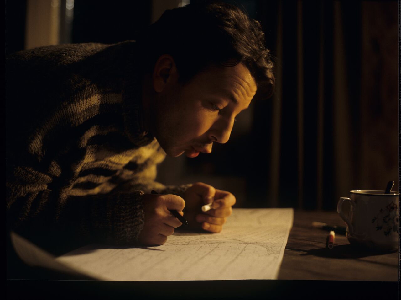 Karol (Zbigniew Zamachowski) looking at pland of lands he purchased.