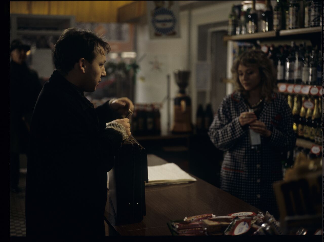 Karol (Zbigniew Zamachowski) buys alcohol to help him persuade the host to sell the land.