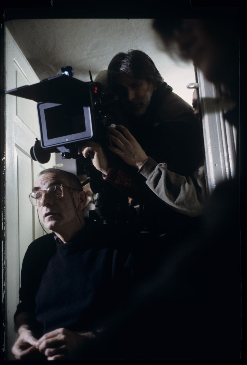 Krzysztof Kieślowski (director) and Edward Kłosinski (cinematographer) and Brigitte Tailladier (sound recordist) during filming a scene.