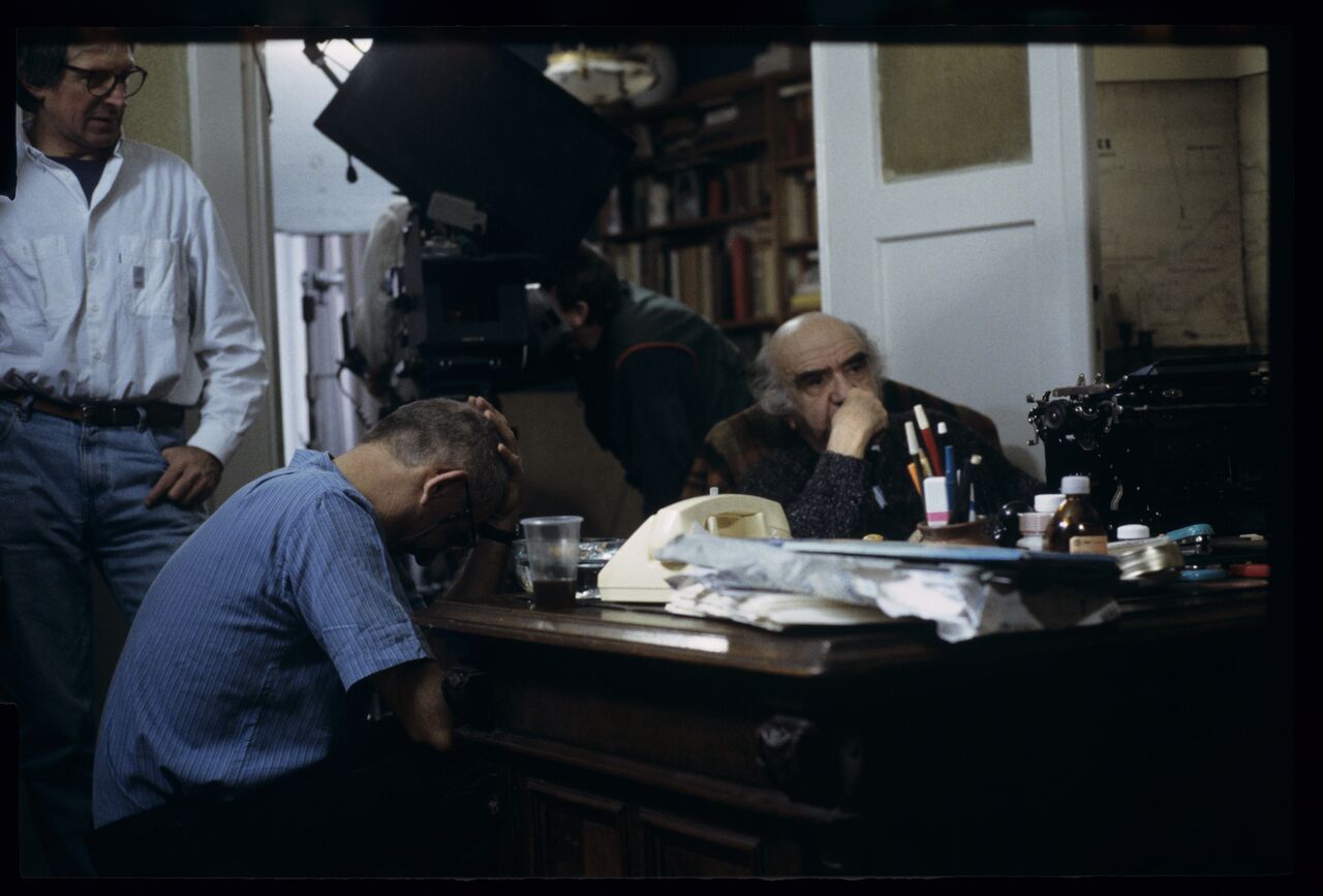 Filming a scene in a notary’s office. Pictured: Aleksander Bardini as the notary, Krzysztof Kieślowski (director), Edward Kłosiński (cinematographer), Henryk Jedynak (co-cinematographer).