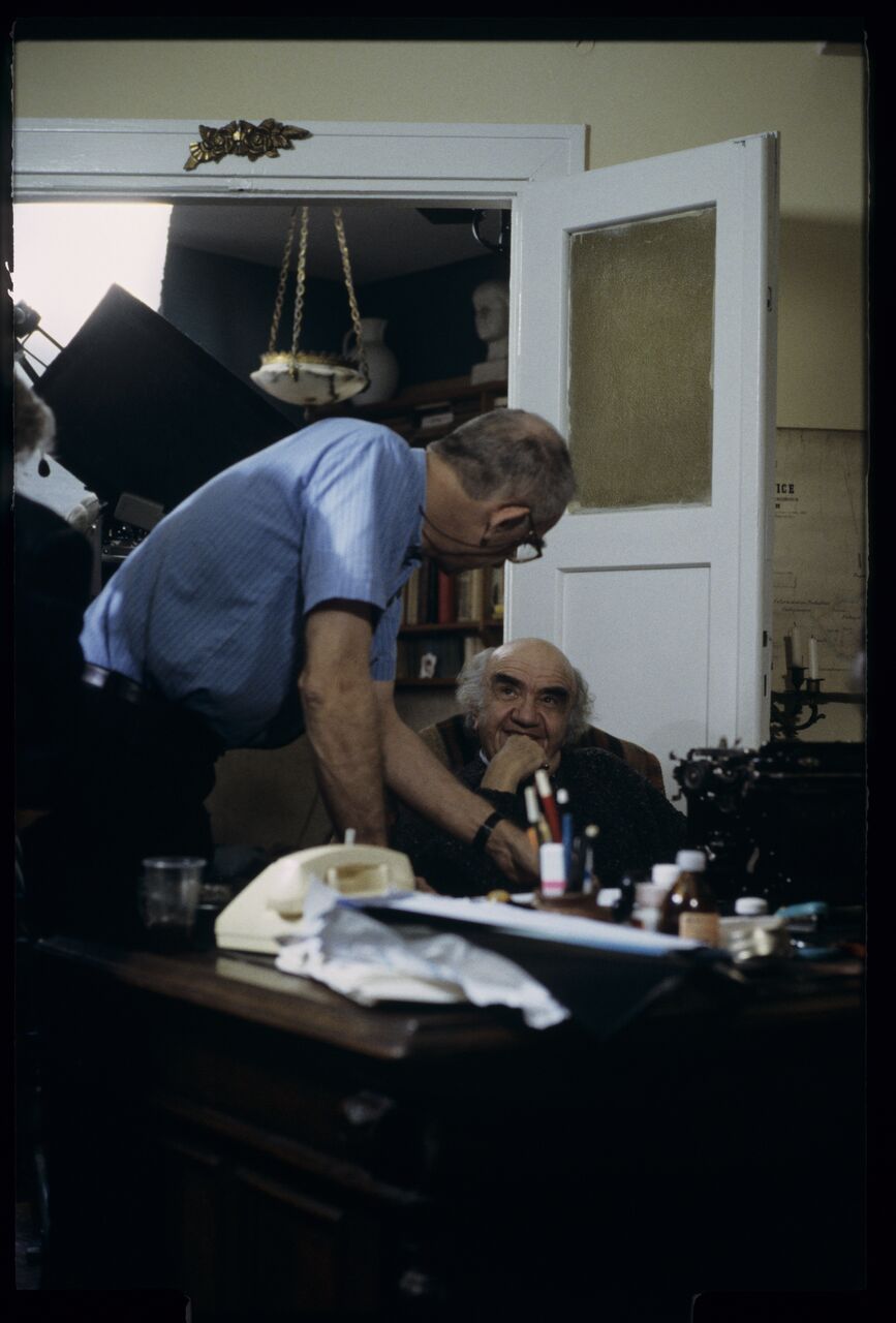 Filming a scene in a notary’s office. Pictured: Aleksander Bardini as the notary and Krzysztof Kieślowski (director).