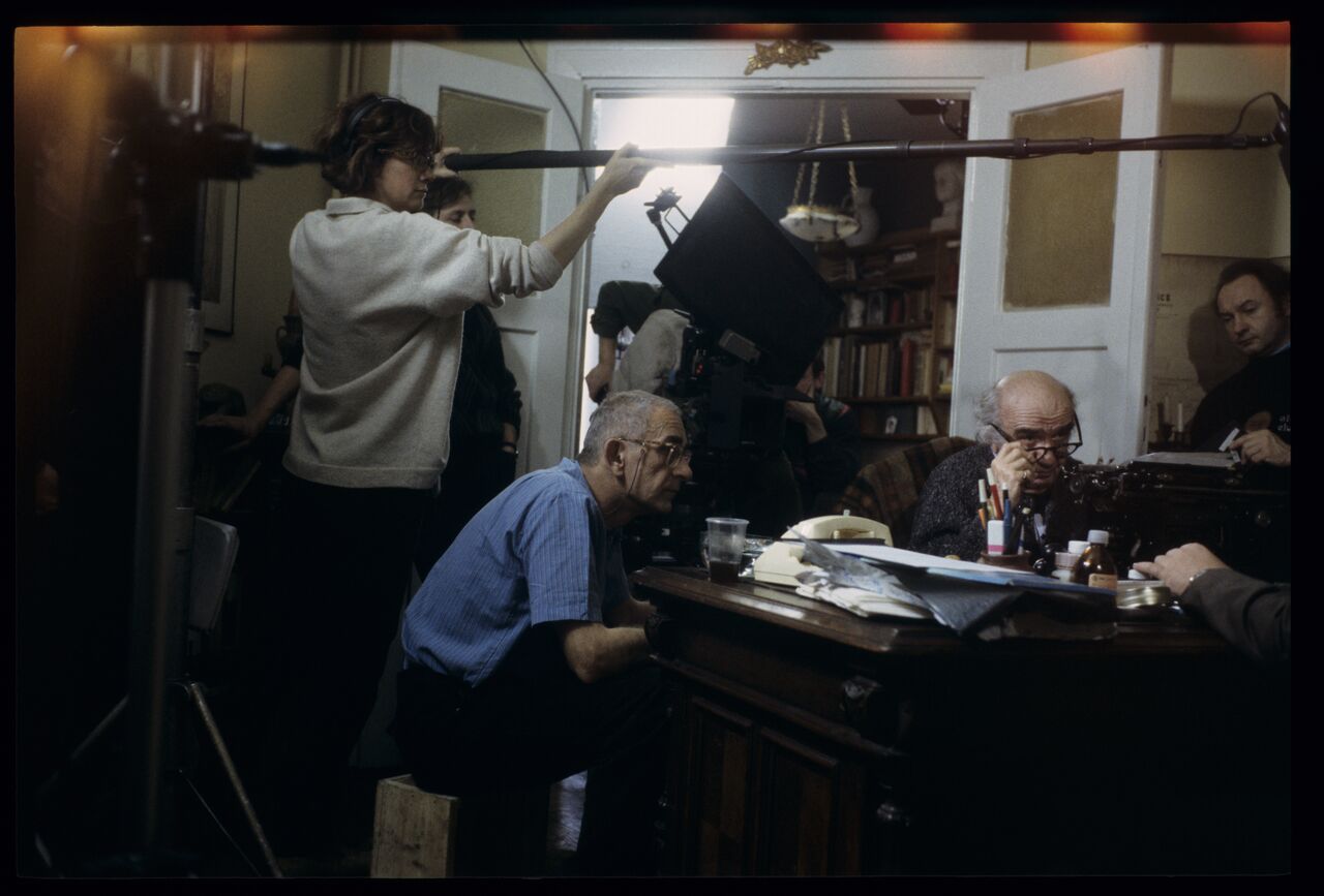Filming a scene in a notary’s office. Pictured: Aleksander Bardini as the notary, Krzysztof Kieślowski (director), Edward Kłosiński (cinematographer), Henryk Jedynak (assistant cameraman), Brigitte Taillandier (sound recorder), Genevieve Dufour (set secretary).