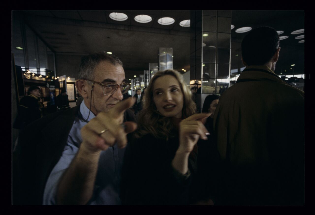 Krzysztof Kieślowski (director) and Julie Delpy (playing Dominique) in the lobby of Orly Airport in Paris.