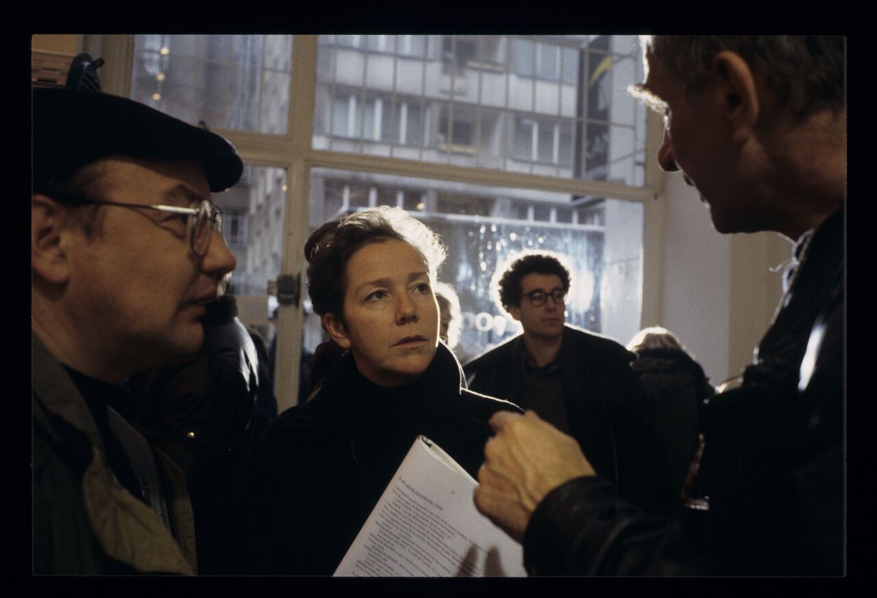 Krzysztof Kieslowski (director), Stan Latek (co-director), Genevieve Dufour (set secretary), and Paweł Łoziński (co-director) on the set.