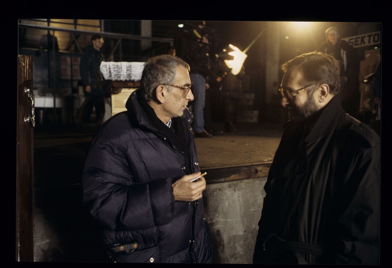 Krzysztof Kieślowski (director) and Krzysztof Zanussi (director, here acting as producer on behalf of the Tor film studio) on the set.
