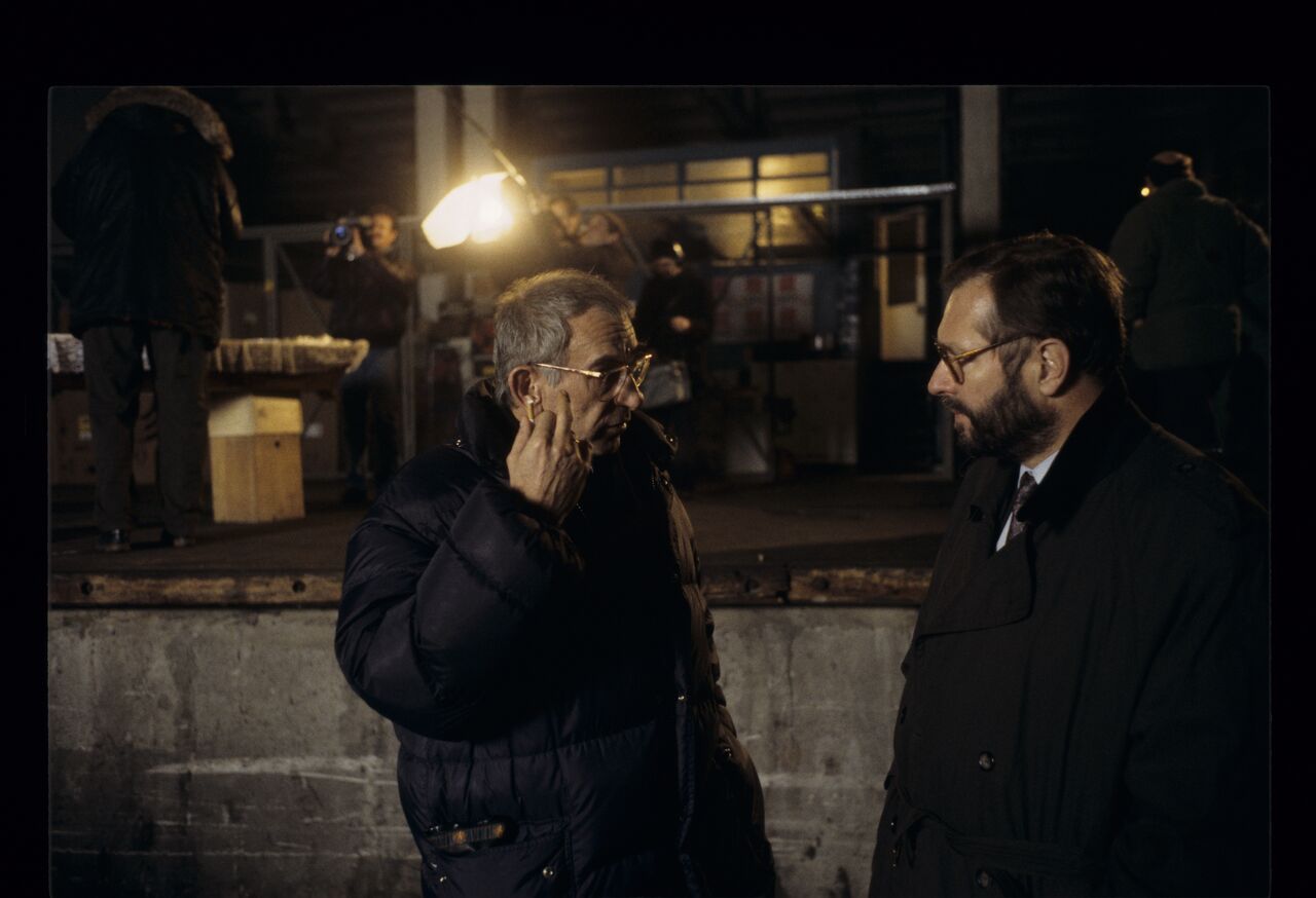 Krzysztof Kieślowski (director) and Krzysztof Zanussi (director, here acting as producer on behalf of Tor Film Studio) on the set.