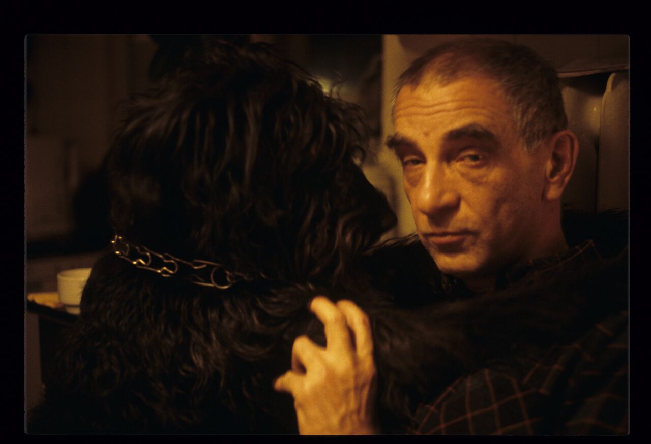 A private photo of Krzysztof Kieślowski with his dog, taken during the filming of “Three Colors. White.”