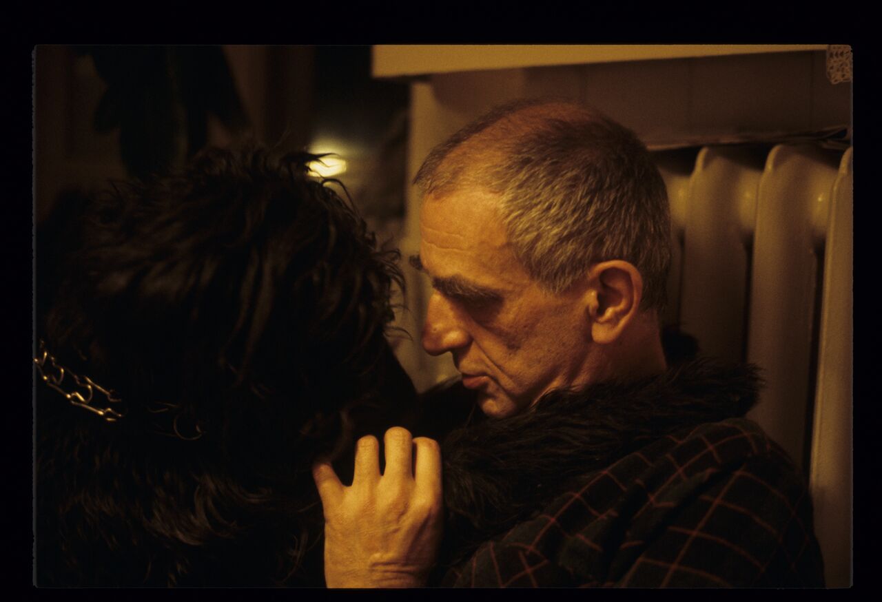 A private photo of Krzysztof Kieślowski with his dog, taken during the filming of “Three Colors. White.”
