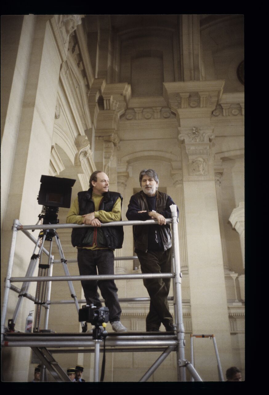 Edward Kłosiński (cinematographer) and Henryk Jedynak (co-cinematographer) are waiting for the filming to begin in the building of the Palais de Justice in Paris, on the scaffolding where the camera is placed.