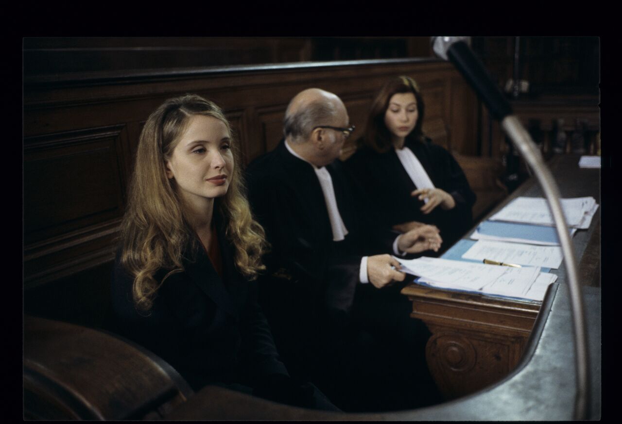 A scene in the courtroom of the Parisian Palais de Justice during the divorce hearing between the film’s protagonist, Karol Karol, and his wife, Dominique. The photo shows Dominique (Julie Delpy) with her lawyers (Jacques Disses and Florence Pernel). Sandrine, the lawyer representing Dominique, is known from another installment in the trilogy, Three Colors. Blue.