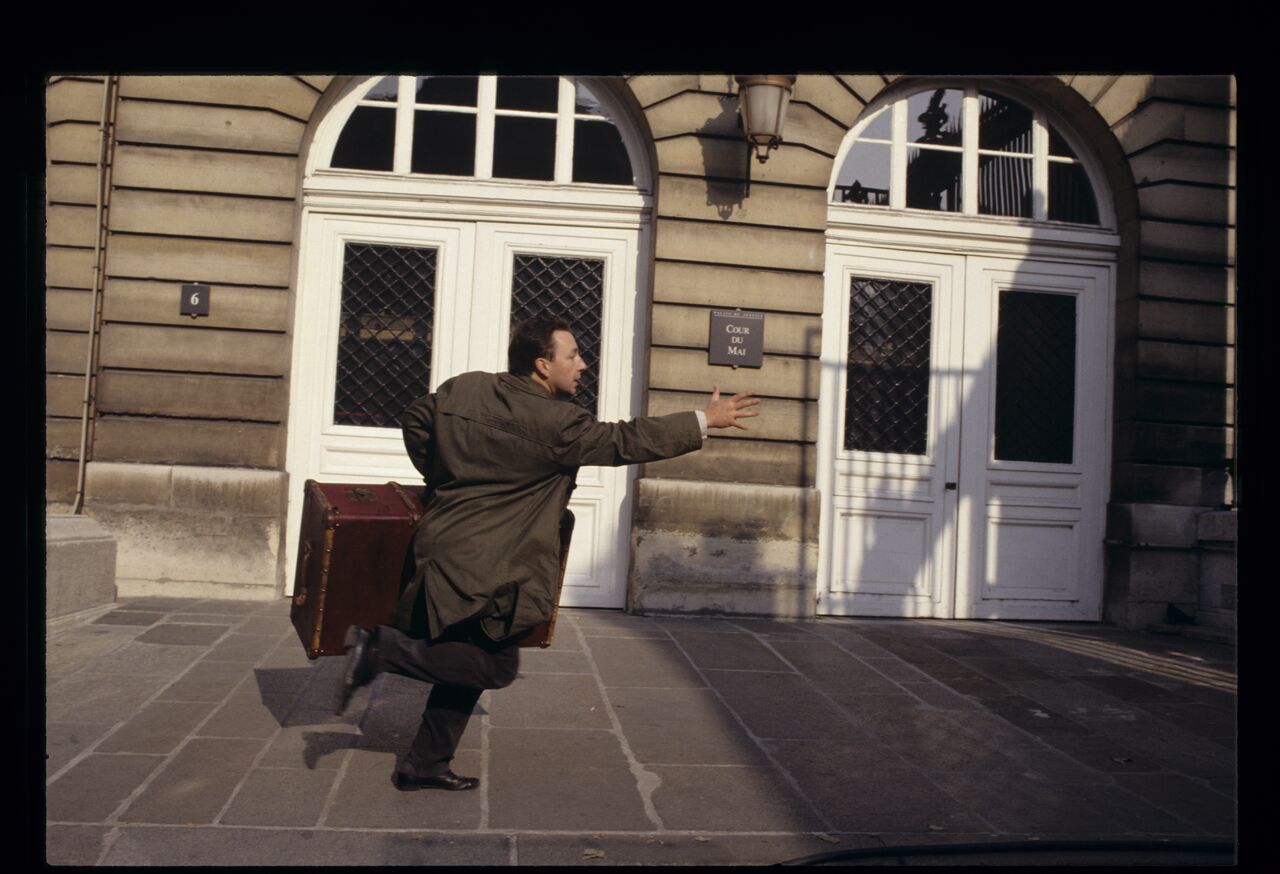 Karol (Zbigniew Zamachowski), suitcase in hand, runs down the street after the car in which his wife is driving away.