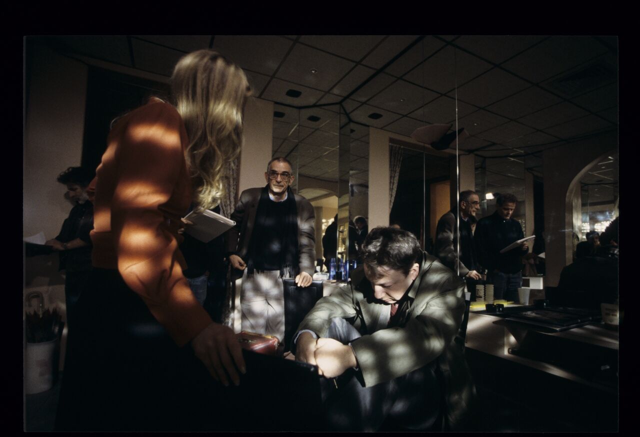 Krzysztof Kieślowski (director), on set at Karol’s hairdressing salon in Paris, observes actors Zbigniew Zamachowski (as Karol) and Julie Delpy (as Dominique) as they reenact another failed attempt to consummate their relationship.