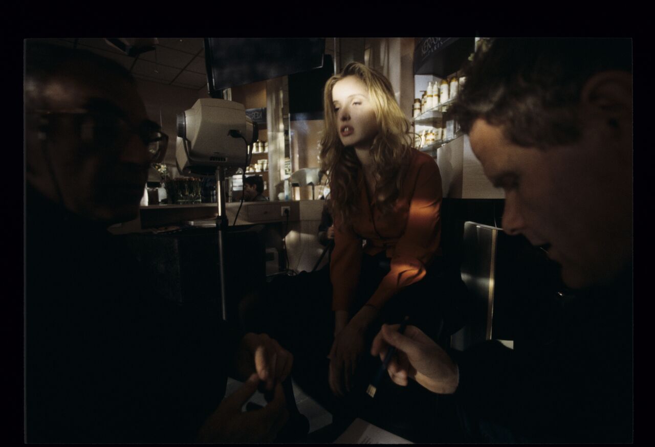 Krzysztof Kieślowski (director) gives instructions to actress Julie Delpy (playing Dominique), with the assistance of translator Roman Gren.
