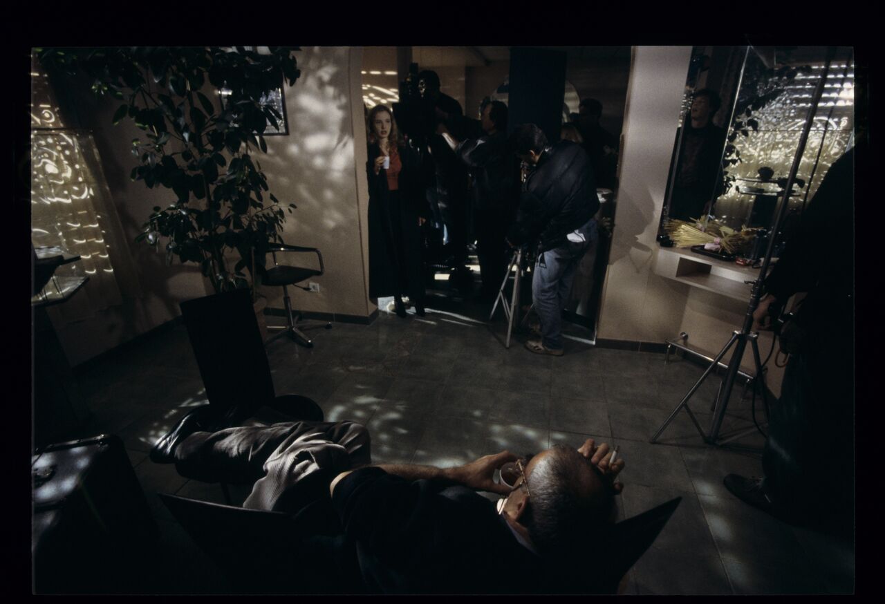 A break between takes. Krzysztof Kieślowski (director), in the foreground, lying on the floor, surrounded by the crew of the leading female actor, Julie Delpy, in the background.