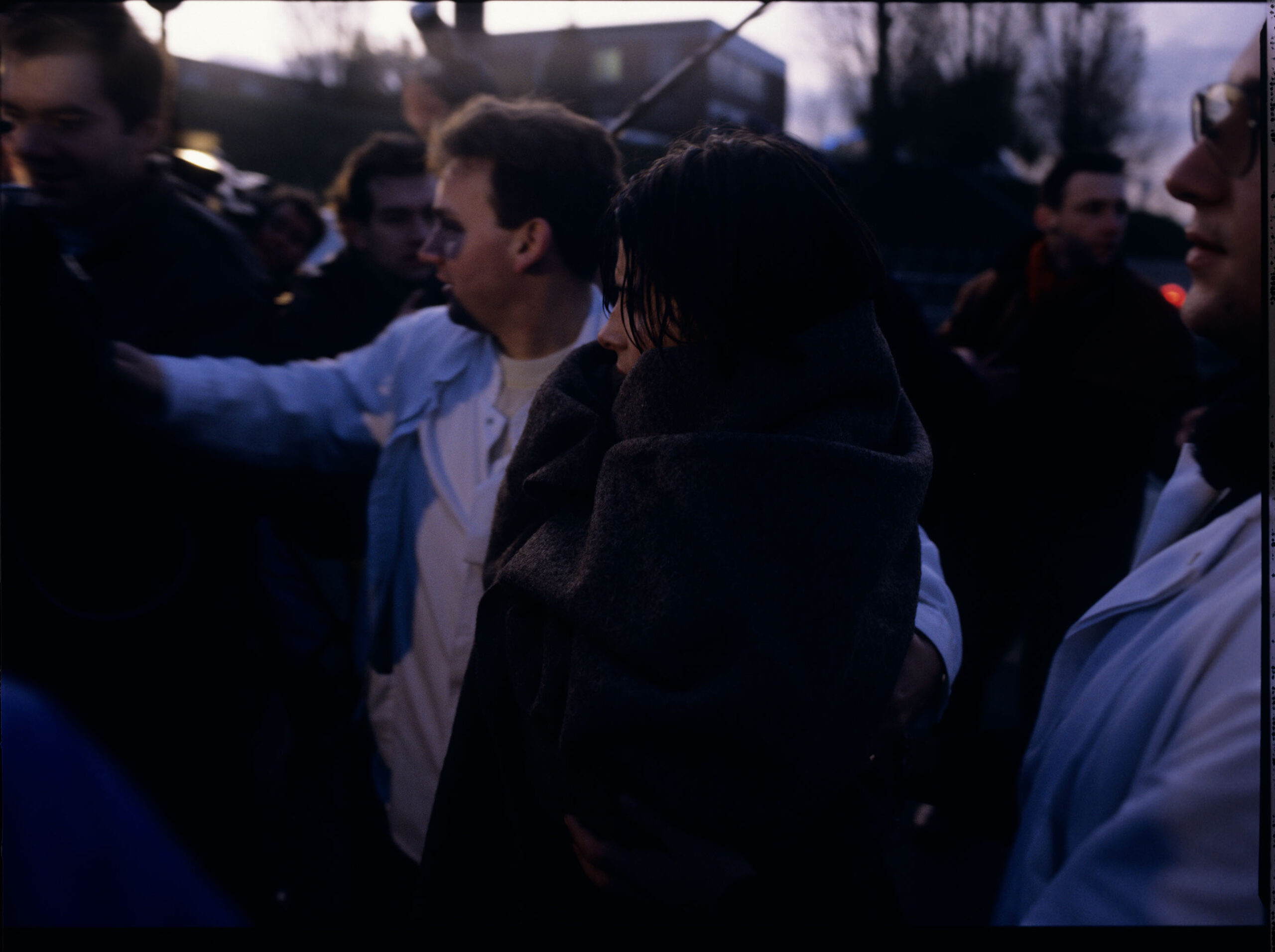Filming a rescue scene after a ferry disaster in England. The photo shows Irene Jacob as Julie Vignon, surrounded by the crew.