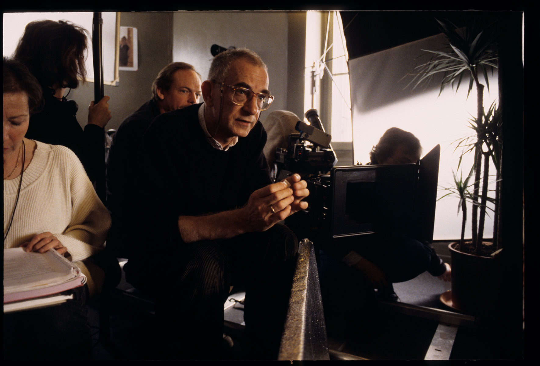 The crew on the film set in Valentine’s apartment. The photo shows: Krzysztof Kieślowski (director), Piotr Sobociński (cinematographer), Genevieve Dufour (set secretary), Brigitte Taillandier (sound operator).
