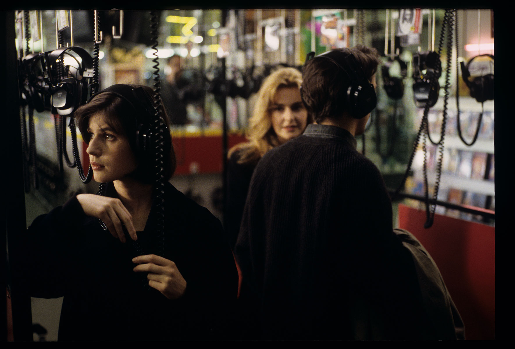 Valentine (Irene Jacob) in a music shop listening to a fictional Dutch composer Van den Budenmayer (in fact this music was composed by Zbigniew Preisner). At the next stand we can see Auguste (Jean-Pierre Lorit) and Karin (Frederique Feder) – characters from a parallel thread of the film