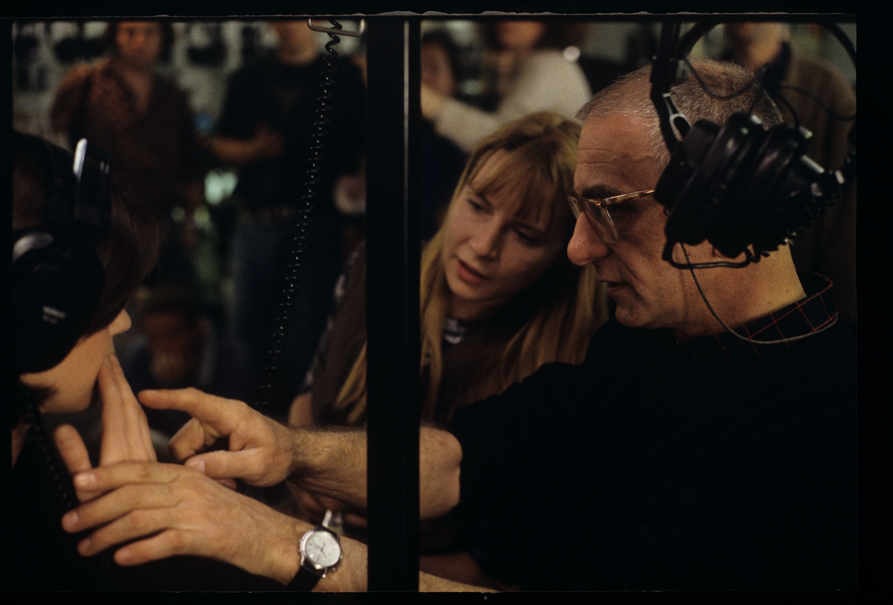 Krzysztof Kieślowski (director) gives instructions to actress Irene Jacob (playing the role of Valentine) while filming a scene in a music store where Valentine is listening to an album by the fictional Dutch composer Van den Budenmayer (in reality, the music was written by Zbigniew Preisner).
