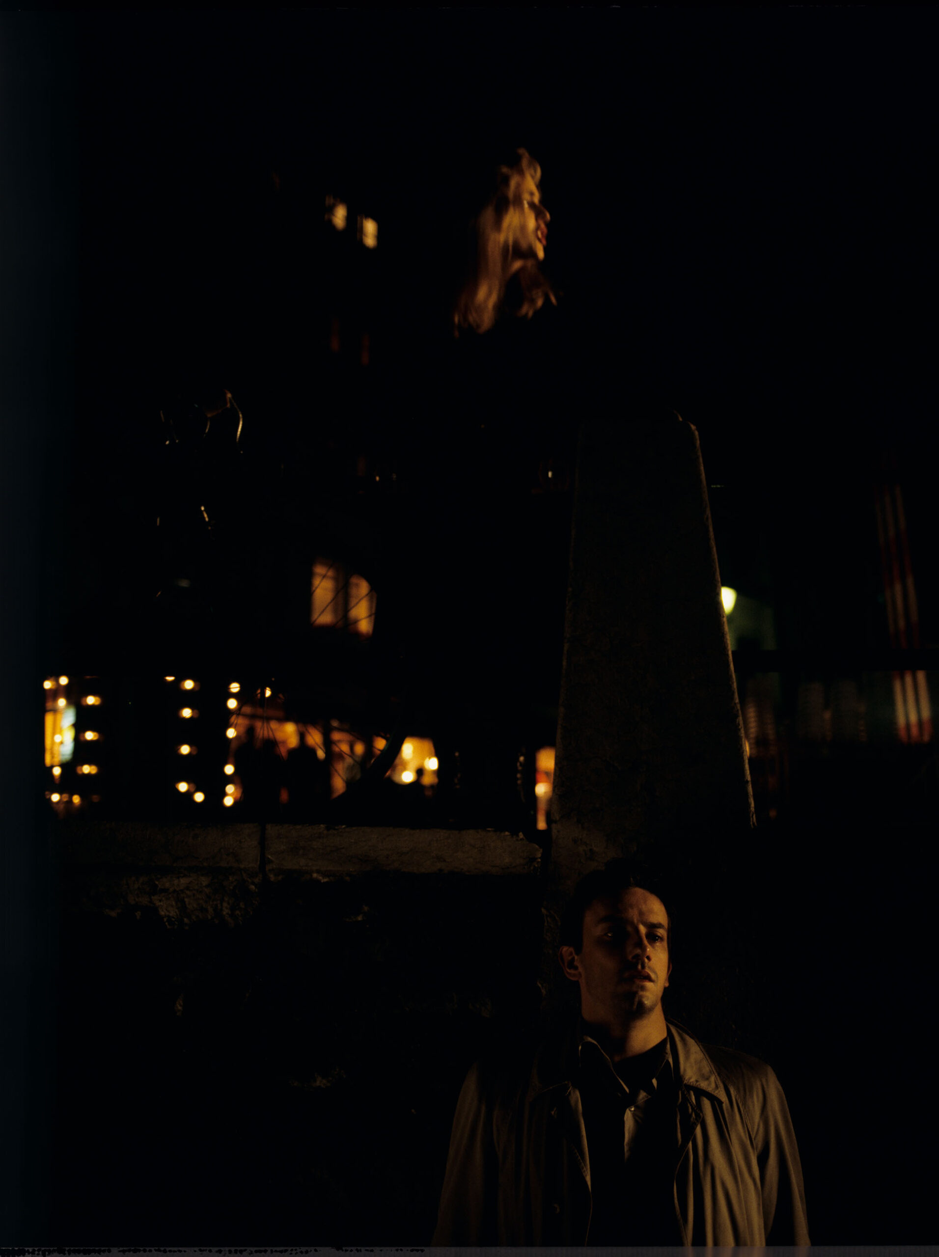 A still of Auguste (Jean-Pierre Lorit) hiding from his partner Karin (Frederique Feder) after seeing her in a café with another man.