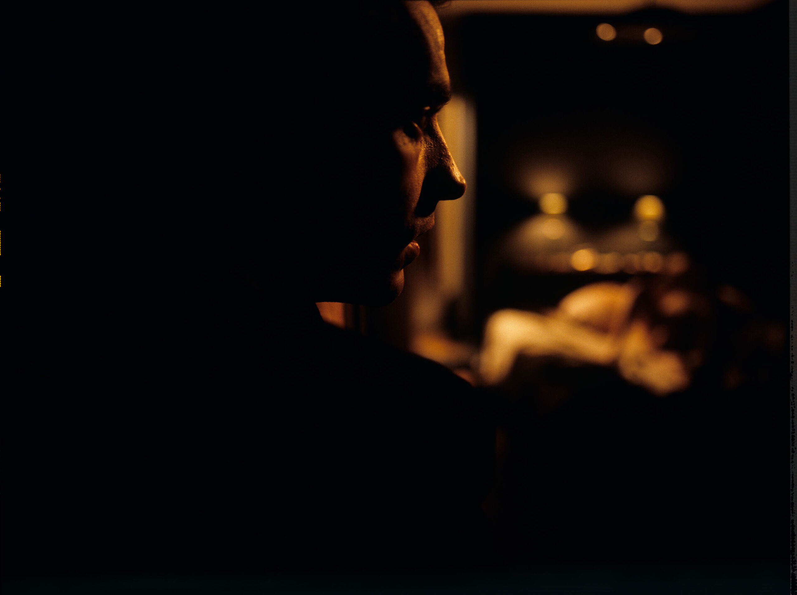 A still of Auguste (Jean-Pierre Lorit) watching his partner Karin (Frederique Feder) with another man through the window.