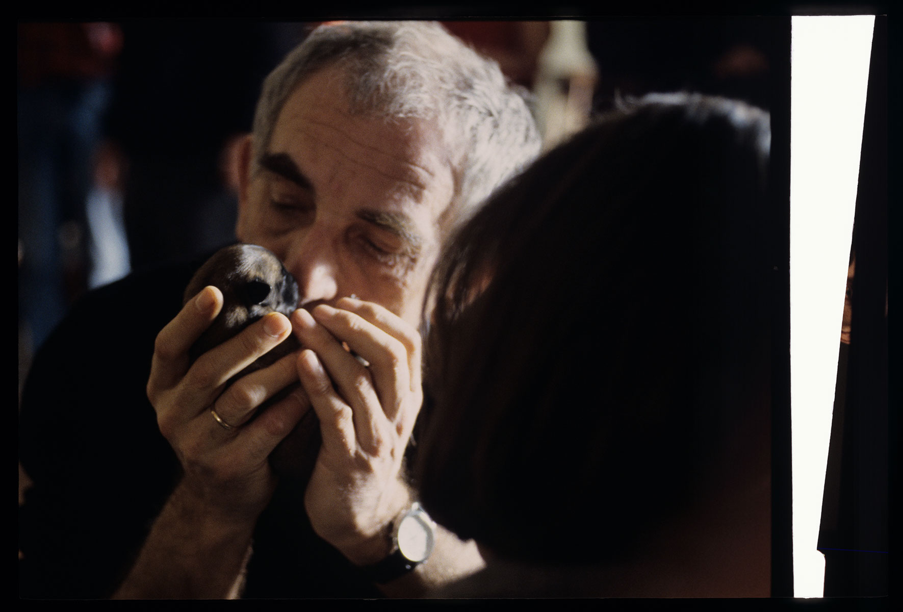 Krzysztof Kieślowski (director) with a puppy born by the dog Rita, on the set in the judge’s apartment.