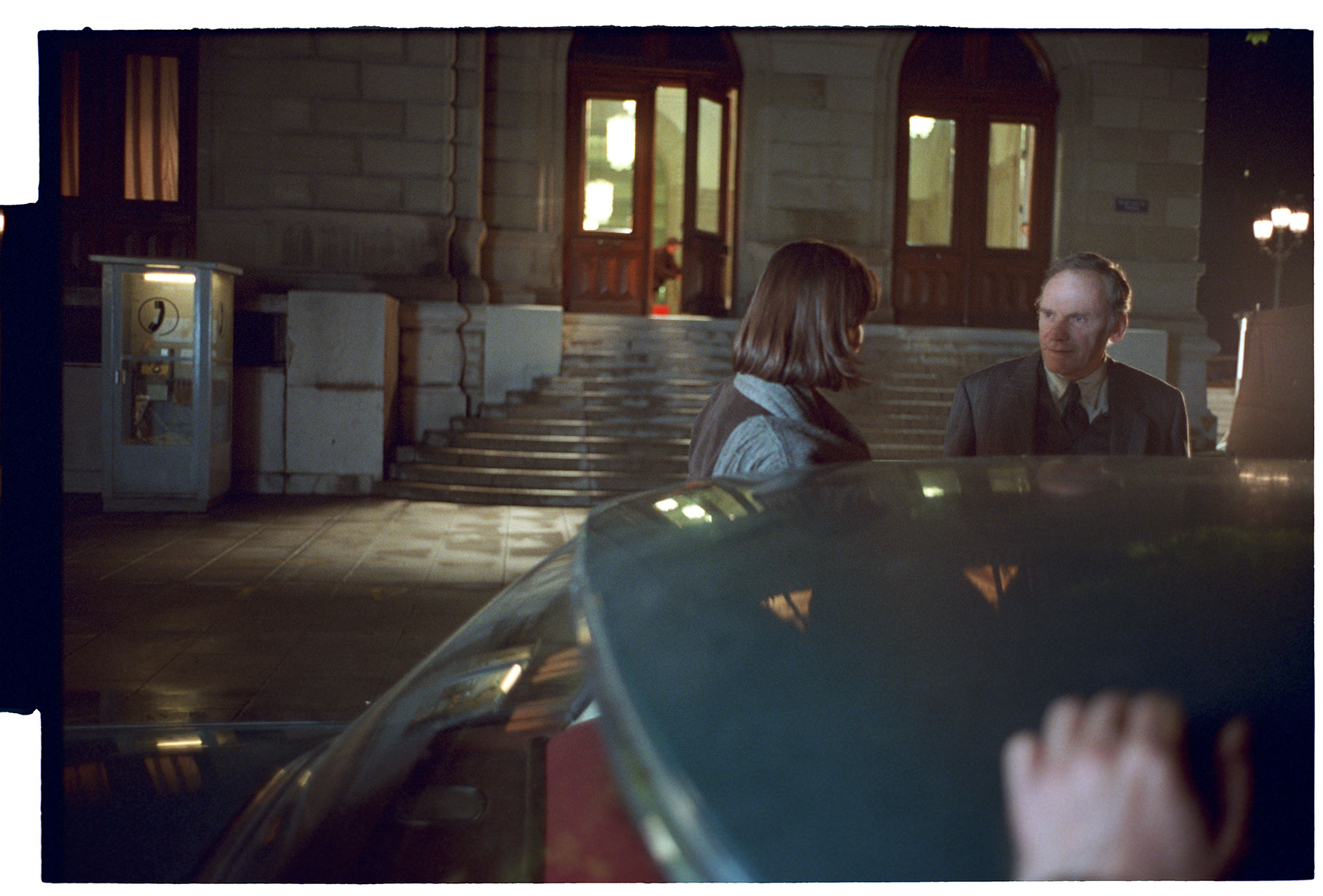Shooting the farewell scene between the judge and Valentine in front of the theater where a fashion show with Valentine took place. In the photo are Irene Jacob and Jean-Louis Trintignac.