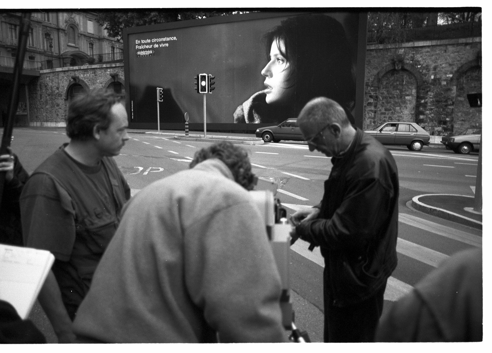 The set on a Geneva street, where an advertising billboard with the image of the main character of the film was hung. In the foreground, director Krzysztof Kieślowski, behind the camera Piotr Sobocinski (cinematographer), next to Henryk Jedynak (camera cooperation).