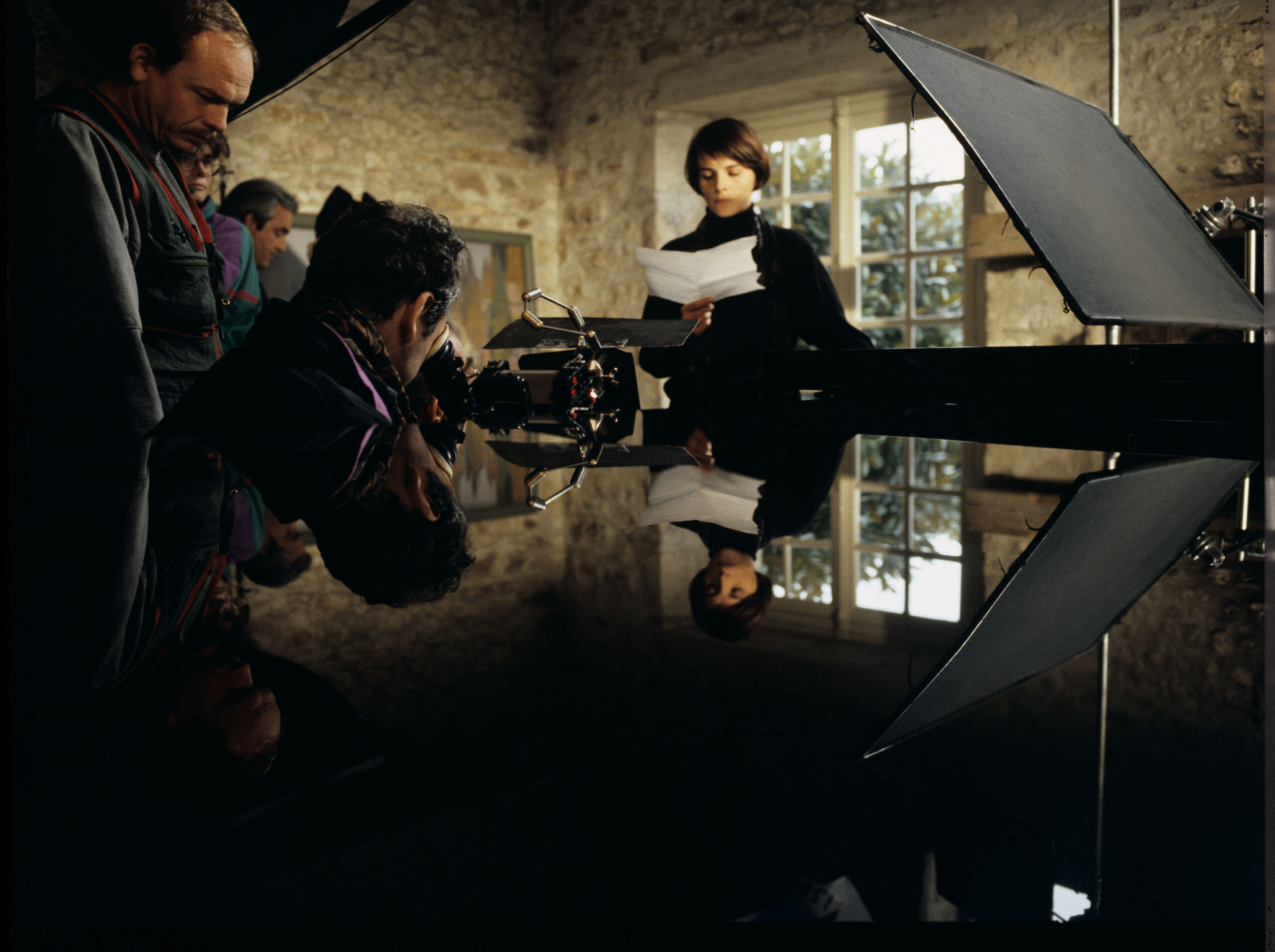 Filming a scene in the living room of the suburban de Courcy family estate, where Julie discovers a sheet with the musical notes of the final fragment of the oratorio “Song for the Unification of Europe,” composed by her tragically deceased husband. In the photo: Juliette Binoche (playing the role of Julie), Sławomir Idziak (director of photography), Henryk Jedynak (operator’s assistant), Brigitte Taillandier (sound operator).