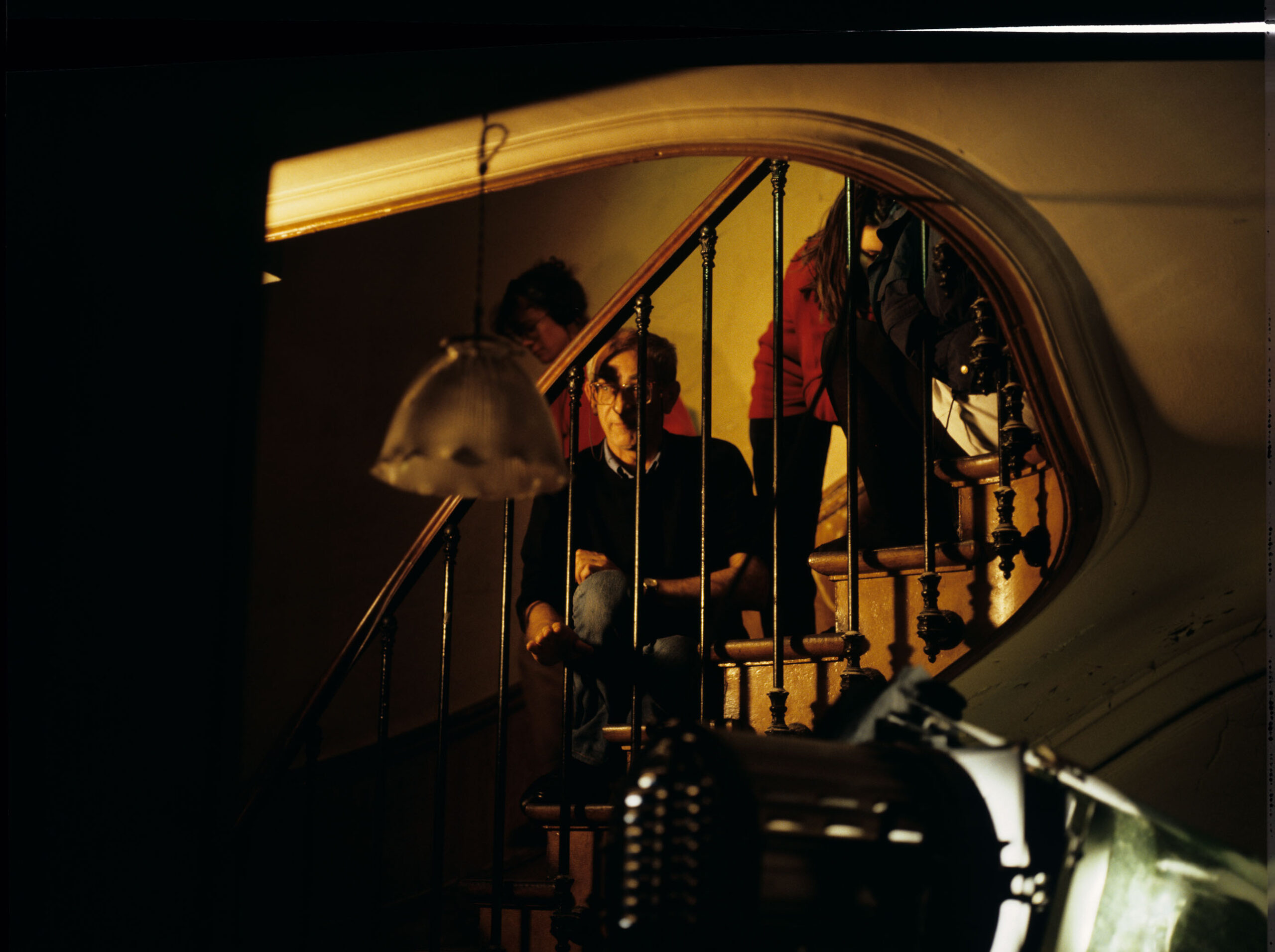The crew is on set during the shooting of a scene when Julie, concerned about the noises in the stairwell, leaves the apartment and accidentally slams the door behind her. The photo shows: Krzysztof Kieślowski (director) and Brigitte Taillandier (sound operator).
