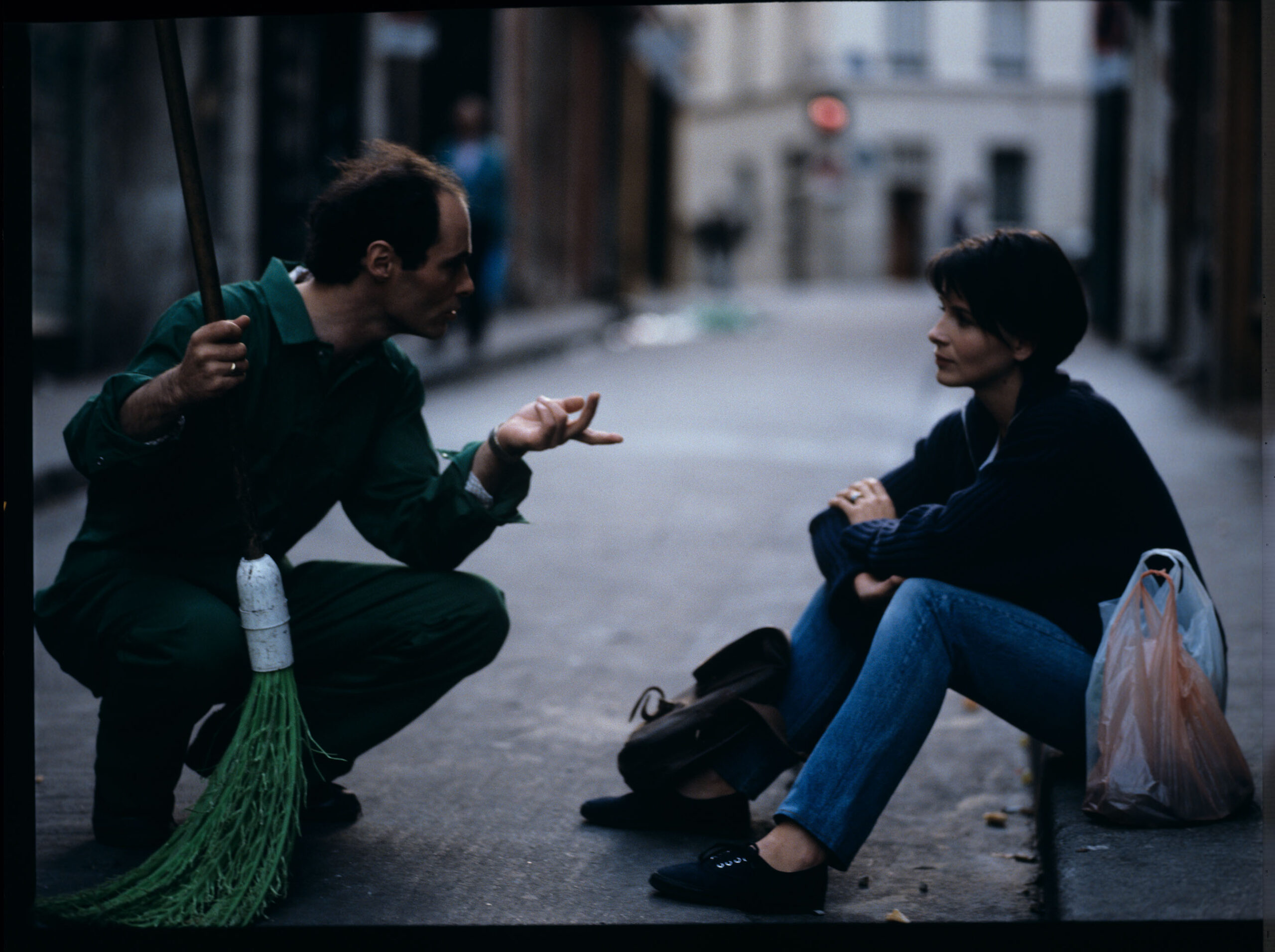 Julie (Juliette Binoche) is sitting on the sidewalk and talking to a street cleaner. The scene did not appear in the film.