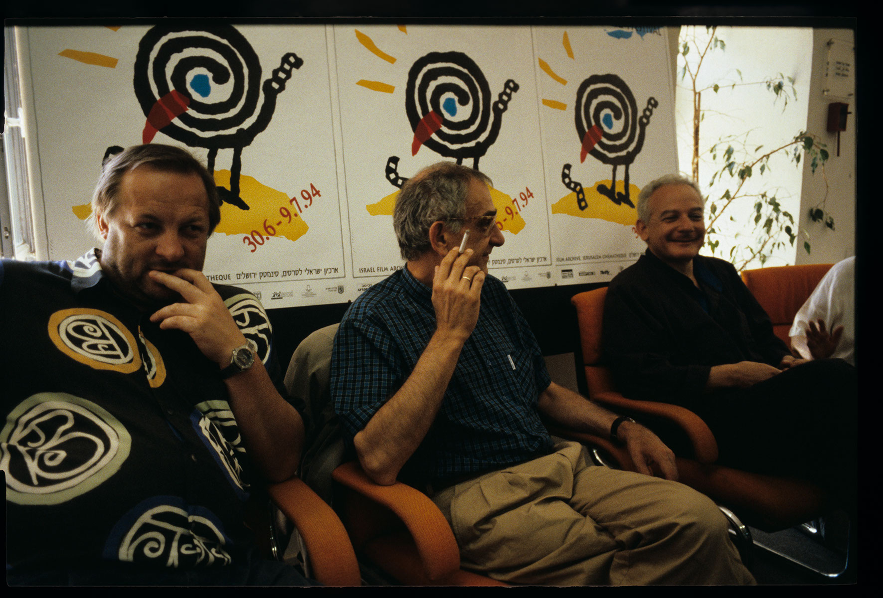 Zbigiew Preisner (composer of music for the film), Krzysztof Kieślowski (director) and Marin Karmitz (producer of the films “Three Colors”) as guests of the Jerusalem Film Festival in 1994.