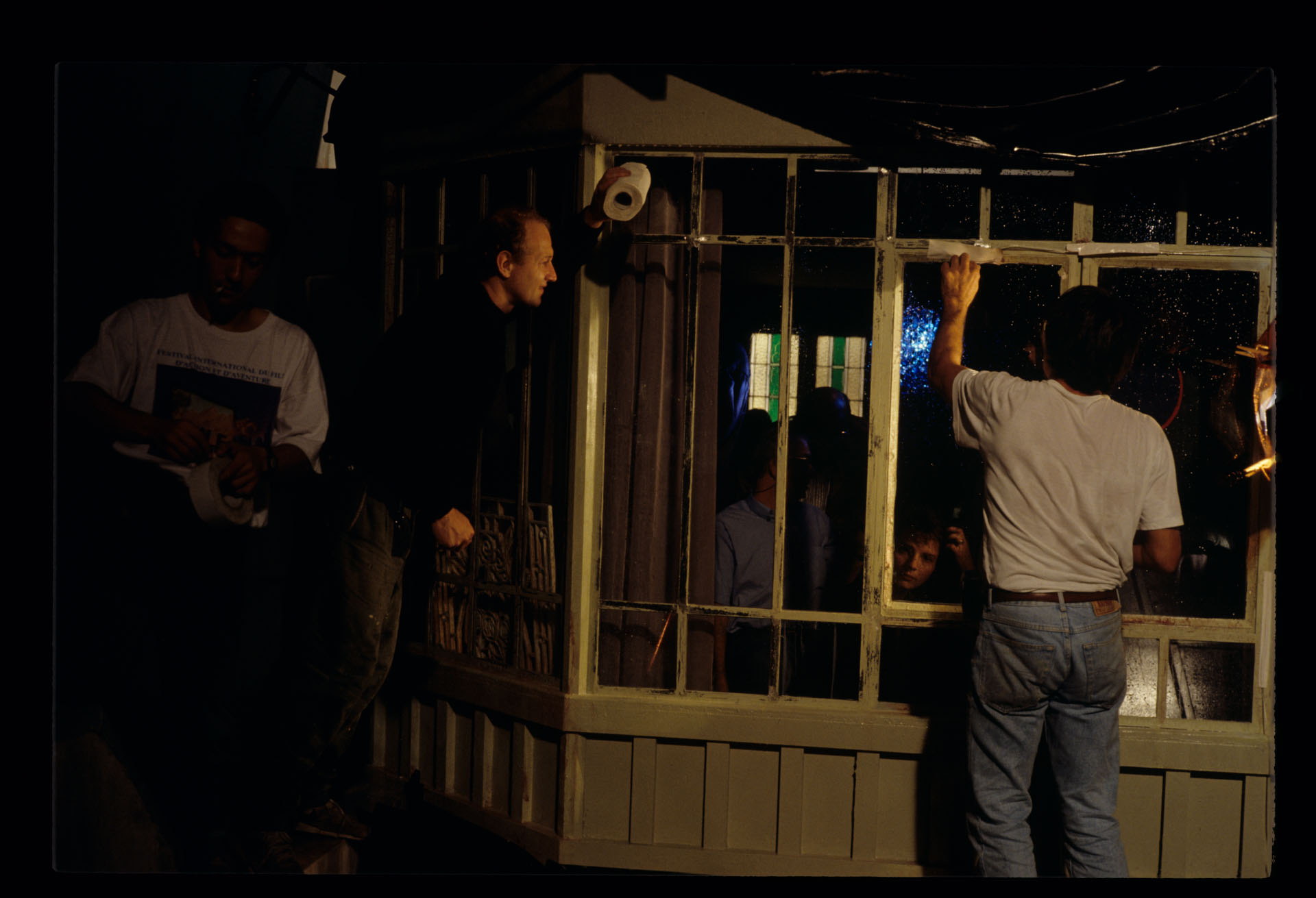 Working on the scene where Julie watches a raindrop drip down the window. In the foreground, prop master Michael Chavraz is seen with his assistants, while in the background, on the other side of a mock window, are Krzysztof Kieślowski (director) and Juliette Binoche (as Julie). This scene, described in great detail in the script, did not make it into the final film.