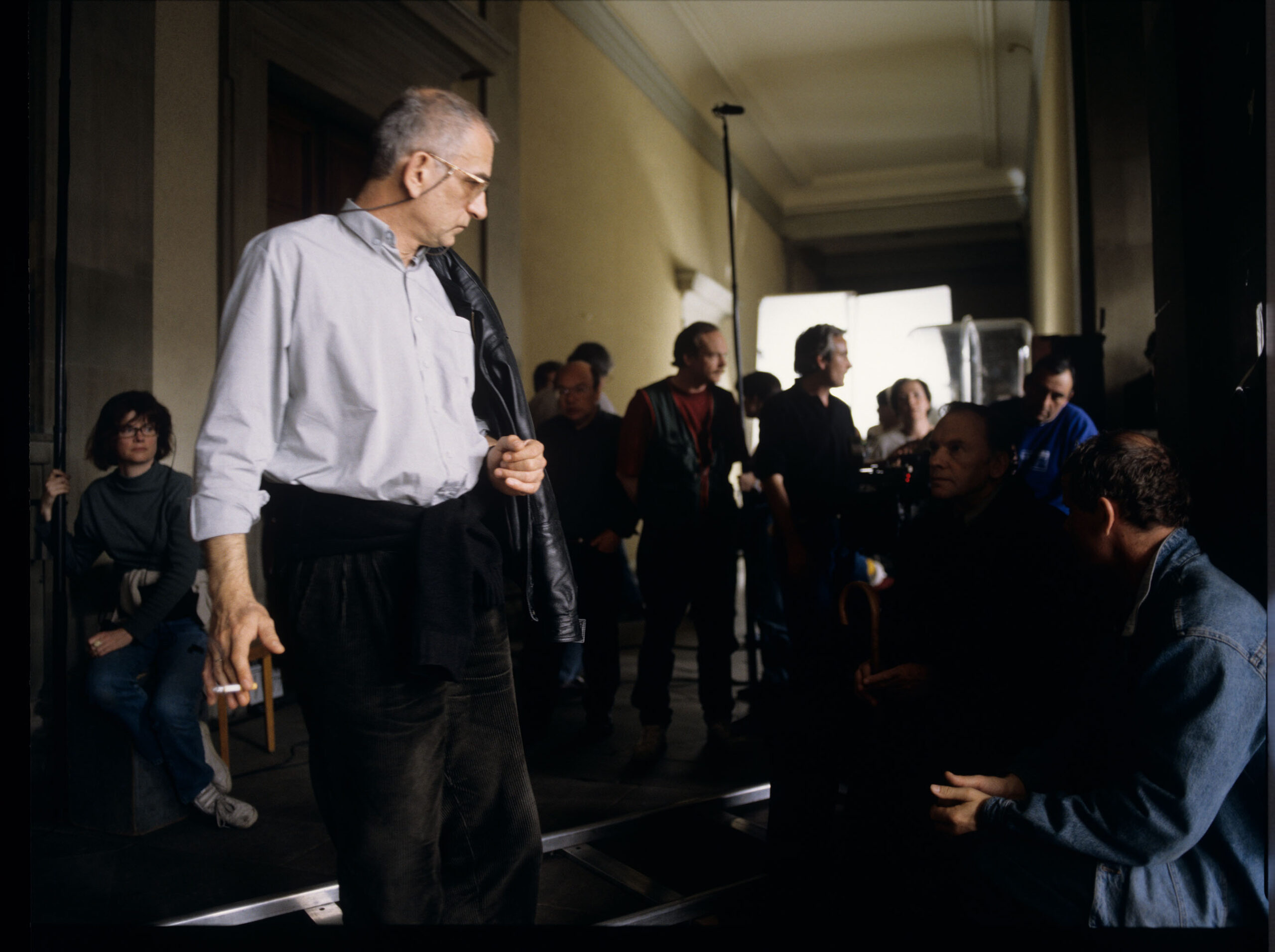 Krzysztof Kieślowski (director) surrounded by the crew on the set in the court corridor, where retired judge Joseph Kern is waiting for the trial in which he is accused of eavesdropping on neighbors’ telephone conversations. Also visible in the photo: Jean-Louis Trintignant (playing the role of the judge), Roman Gren (translator), Henryk Jedynak (director’s assistant), Brigitte Taillandier (sound operator), Stan Latek (director’s assistant).